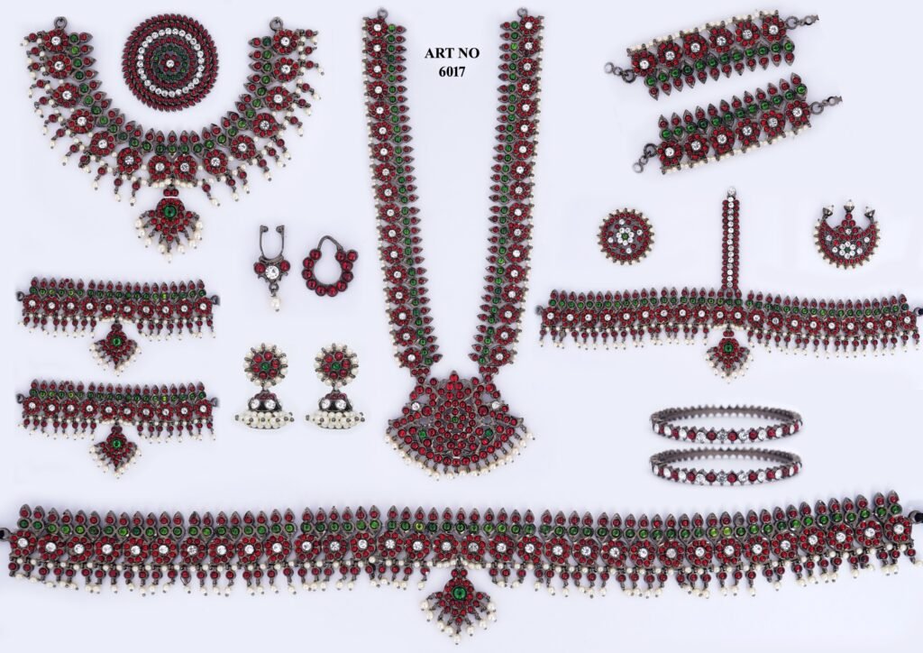 Temple Jewellery (Bharatanatyam & Kuchipudi): Traditionally made of gold-plated silver or brass and encrusted with red and green Kemp stones. A full set typically includes 10 pieces: a choker (Attikai), long necklace (Malai), waist belt (Ottiyanam), armlets (Vanki), and headgear.